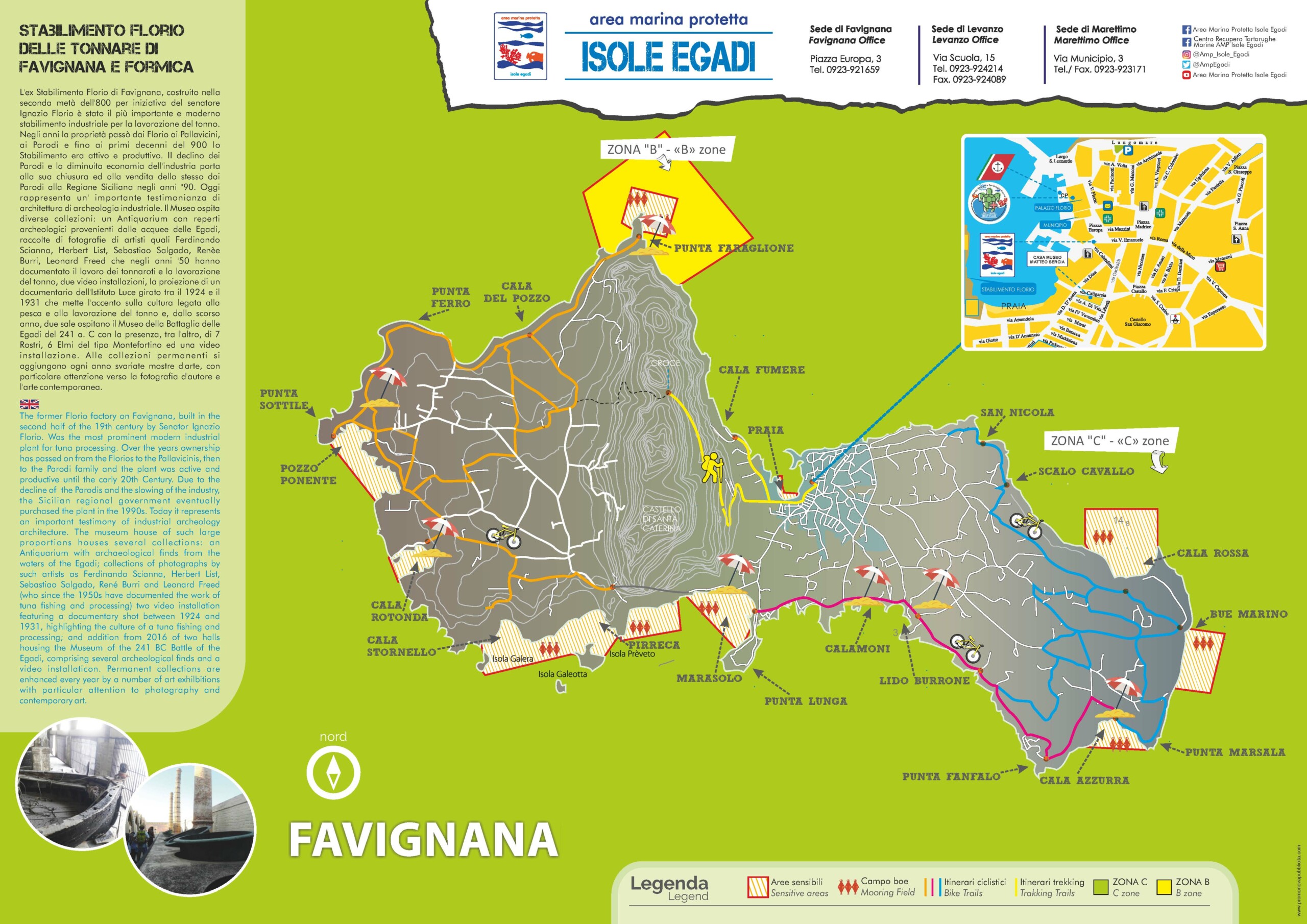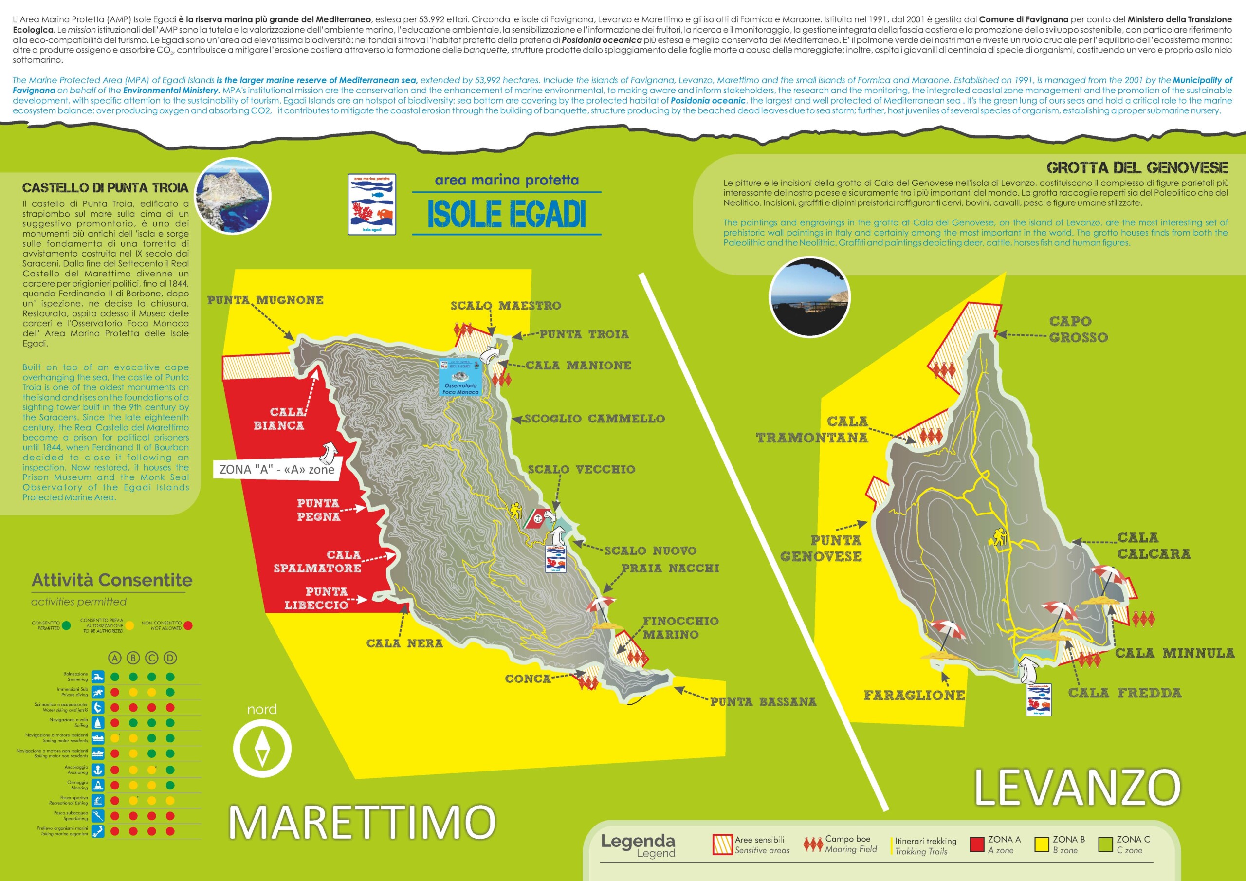 L’Area Marina Protetta è suddivisa in quattro zone (A, B, C e D) a differente livello di protezione e con diverse possibilità d’accesso e limitazioni nella fruibilità. E’ assolutamente opportuno informarsi prima sulle regole; per informazioni e richieste di autorizzazione alle attività da esercitare all’interno dell’AMP: www.ampisoleegadi.it, info@ampisoleegadi.it; l’AMP è anche su Facebook, Twitter e Instagram.